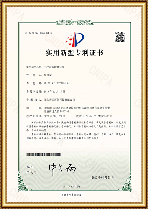 • 實(shí)用新型專利證書(一種凝膠混合裝置)